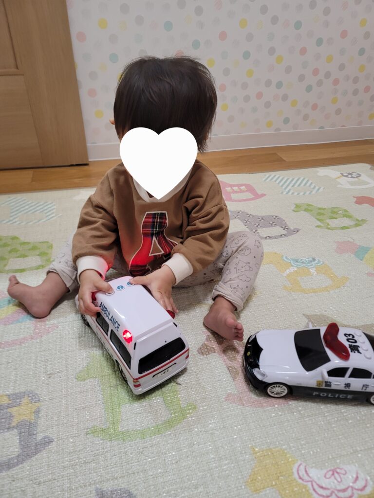 次に車の玩具を選ぶと前や後ろに動かしたり、小さなボタンを何度も押して「ん-、んー」と声を出しながら音の違いを楽しんでいました。
