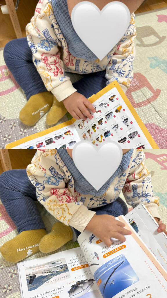 お父さんお母さんと離れてから涙していましたが、大好きなのりものずかんを読むと、「ぶーぶ!」「バス!」と元気な声で教えてくれました。