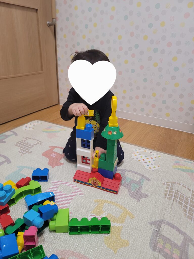 アンパンマンブロックを始めるとお気に入りの形を選び次々に重ねてお家を作っていました。