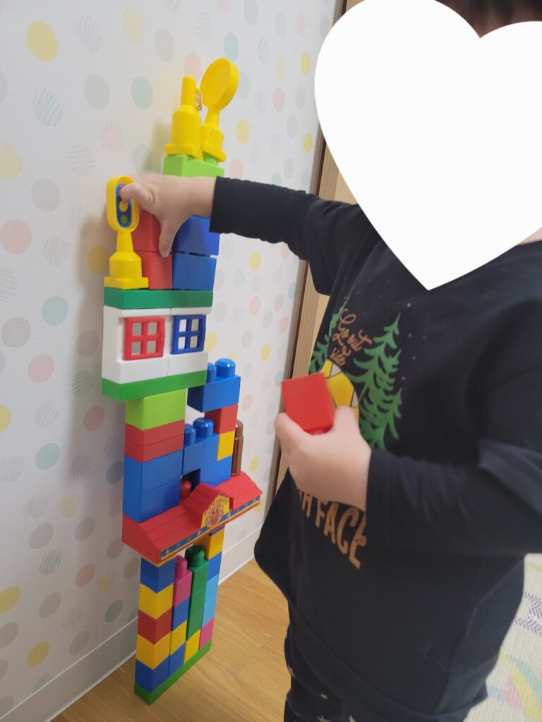 お家の次はブロックを沢山使い、気がつくと背の高さと同じおおきな建物も完成させていましたよ。豪快に解体作業をした後は、とっても上手にお片付けも出来ました。