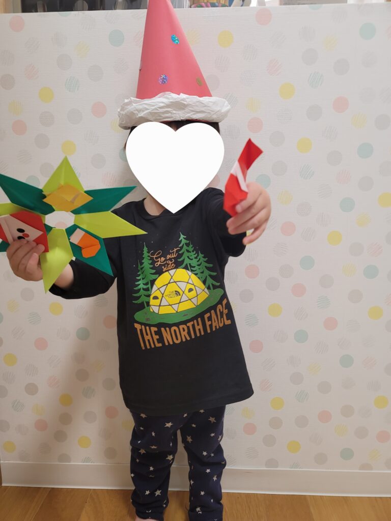 サンタさんの目と鼻のシールも貼ってくれて、クリスマスリースも完成しました。