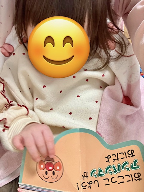 最後にアンパンマンの仕掛け絵本を見せると「あん」といいながら自分から手を伸ばして、仕掛けをめくって楽しんでいました。