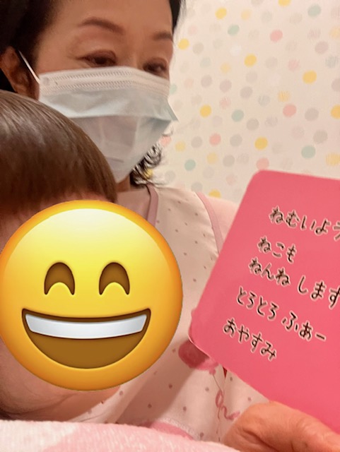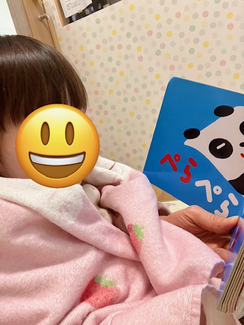 昨日の夜は、あまり眠れていないとのことでしたので、午前寝を促すため膝の上で絵本を読むことにしました。
