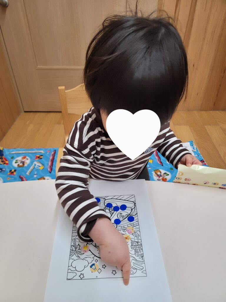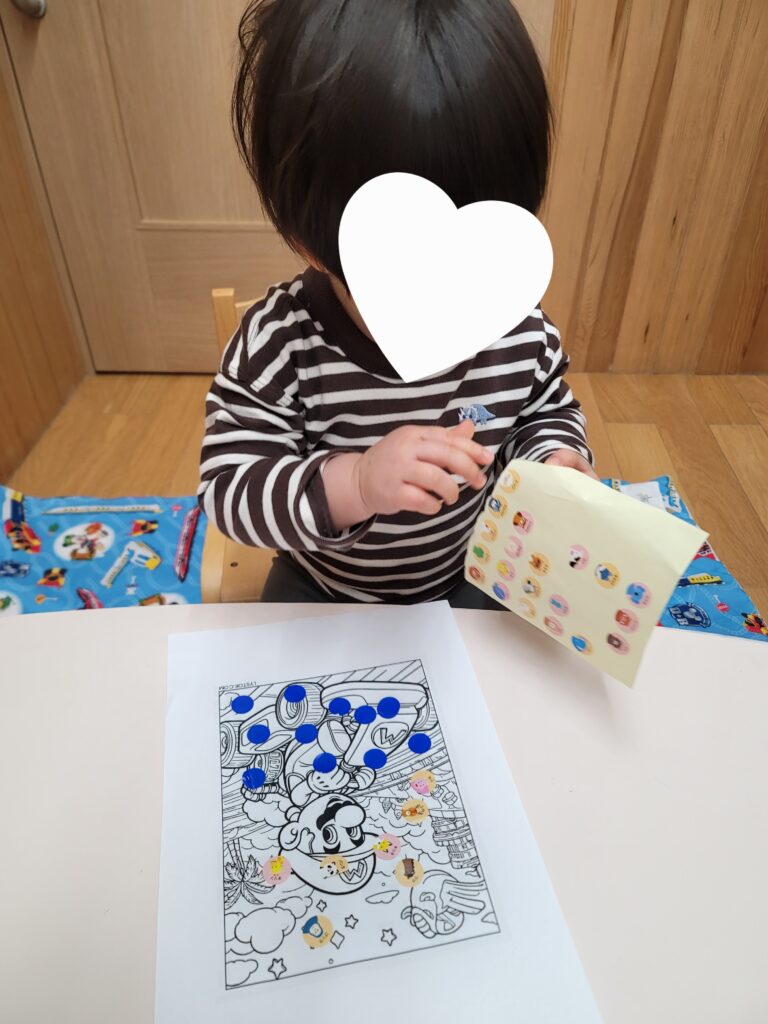 シールを自分ではがして台紙の好きな場所に1枚1枚丁寧に貼っていましたよ。