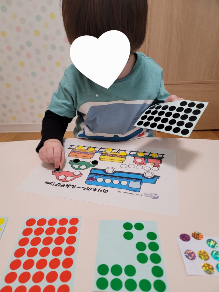 「好きな色を選んで貼ってね」と看護師が声をかけると元気いっぱいに「黄色~!」と