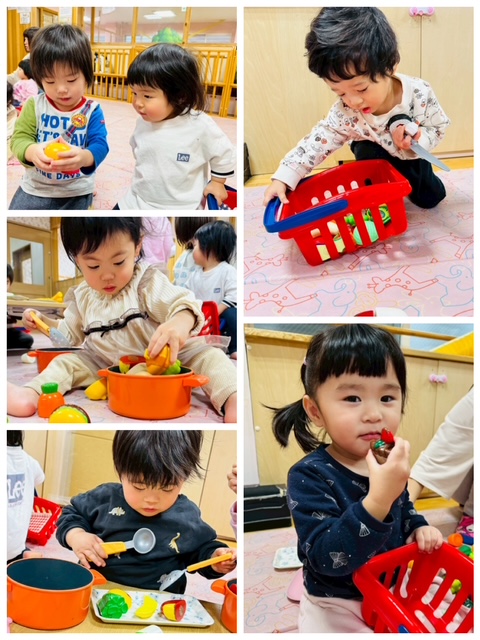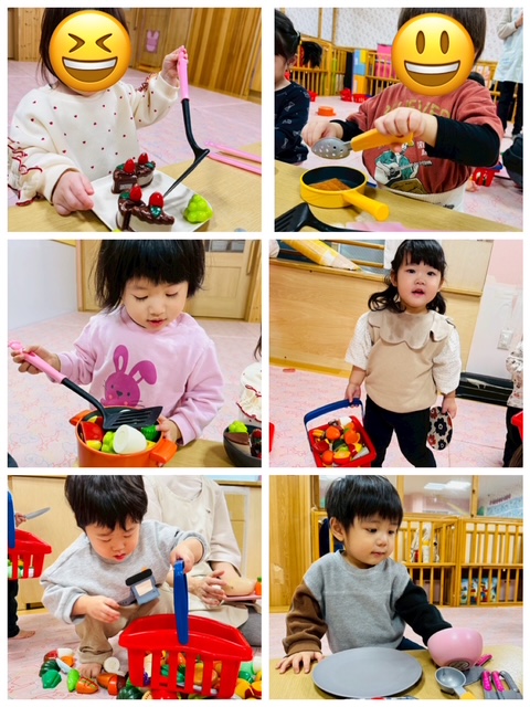 作ったお料理をお友だちに食べさせてあげたり、包丁を使って食べ物を切ったりと楽しんで遊んでいましたよ