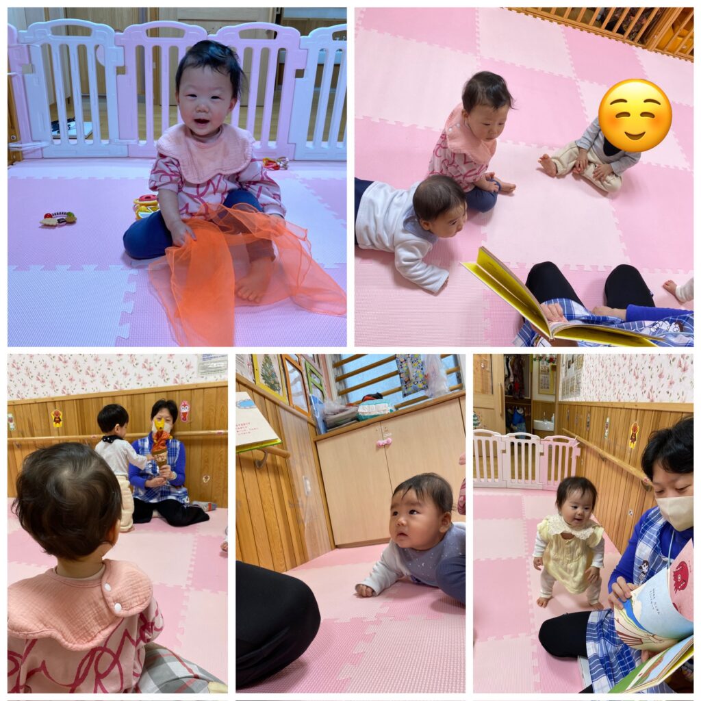 今日の午後はわらべうたをしました。絵本に合わせて歌うと、手を叩いて参加してくれたり、笑って大喜びする姿がありました。