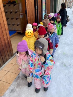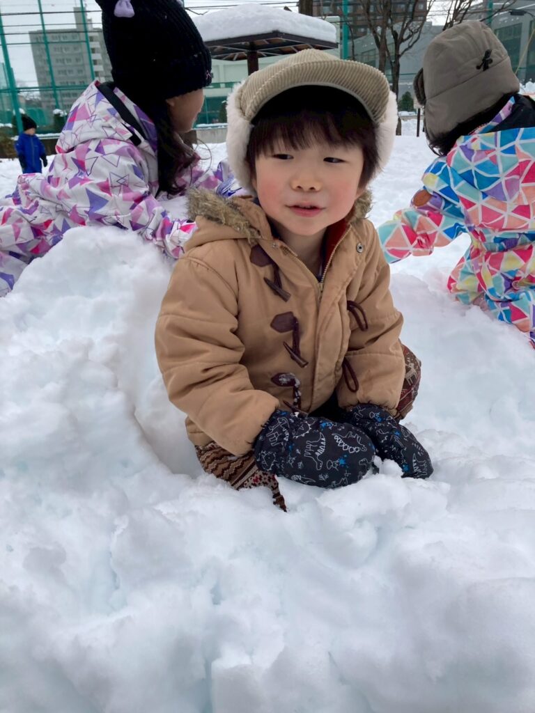 今日は曙もみじ公園で雪遊びをしました。歩道がでこぼこしていて、転んでしまうこともありましたが、頑張って歩きました。