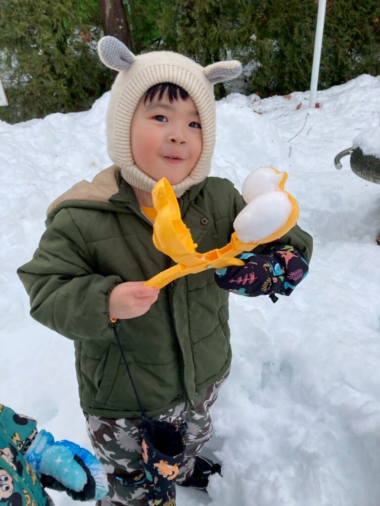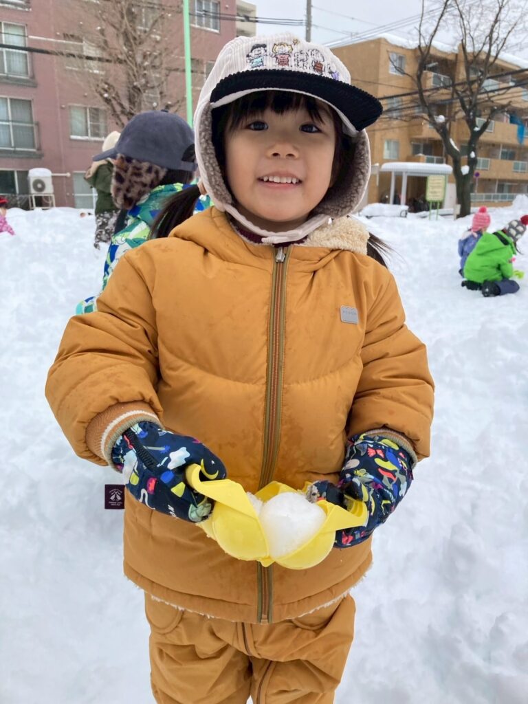 雪を型に入れてハートやひよこを作りました。出来上がると、とても嬉しそうでした。