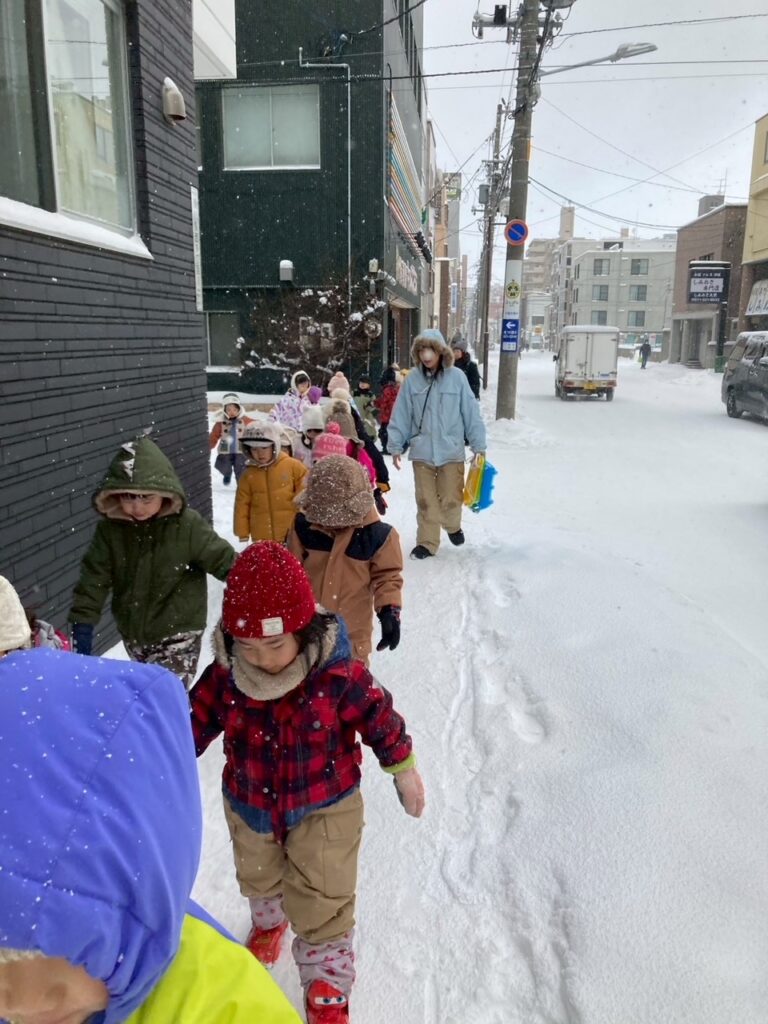 公園内の雪の量が多く、更に“ふわっふわ”で、子どもたちは半分埋まりながら進んでいました。