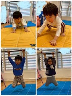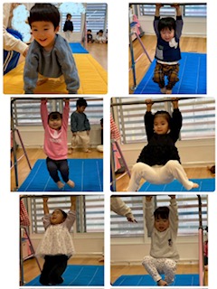 久しぶりの鉄棒でしたがみんな上手にぶら下がり3秒できていました。余裕が出てきて、ゆらゆら身体を揺らす姿もみられましたよ。