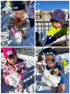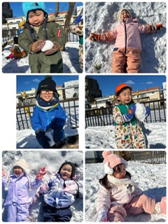 雪をギュッと固めて雪玉を作ったり、サラサラな雪を集めて、空に向かって投げて舞い上がらせたりと様々な遊びで雪を満喫しました。