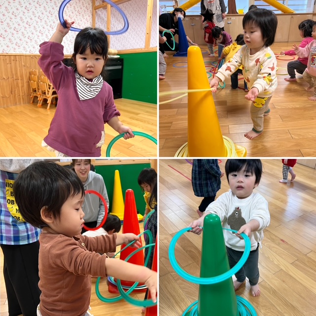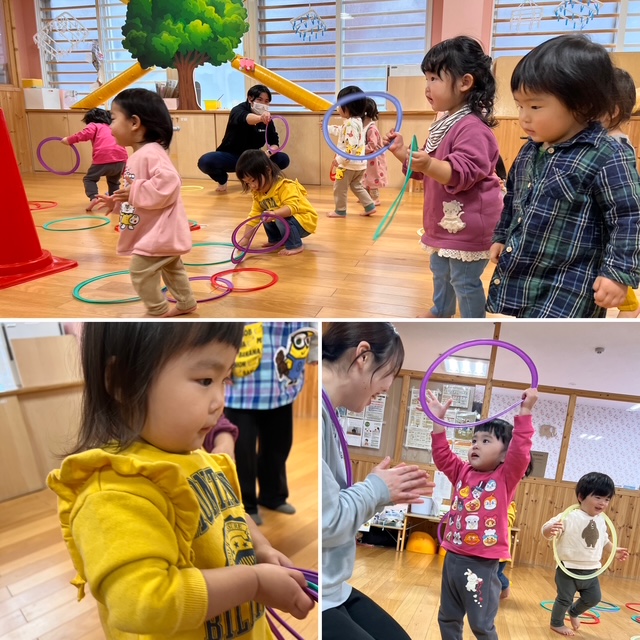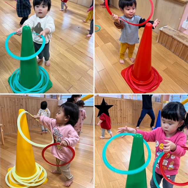 フープの色を元気に「あか」「みどり」と答えることもバッチリないちご組のみんな