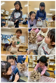 みんなが描いた絵は本日持ち帰っていますので、ぜひご家庭でご覧いただき、きのこ栽培についてお話を聞いてみてください。今日はあいにくのお天気だった為室内での活動となりましたが、みんないきいきとした表情で楽しんでいました。