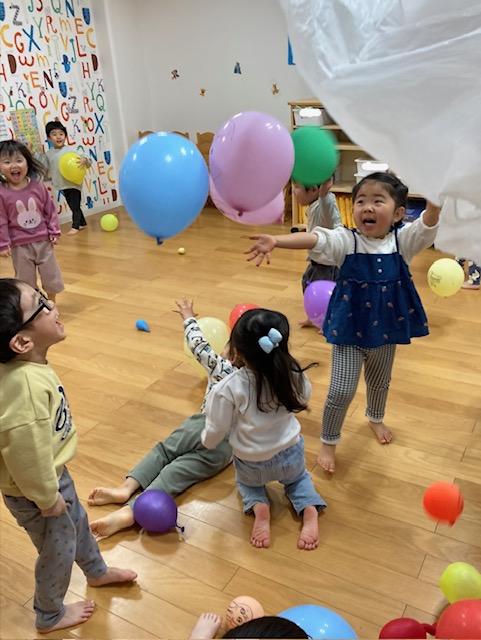 風船が入った袋を見て「今日、風船するの?」「早くやりたい」とワクワクしていた子どもたち。