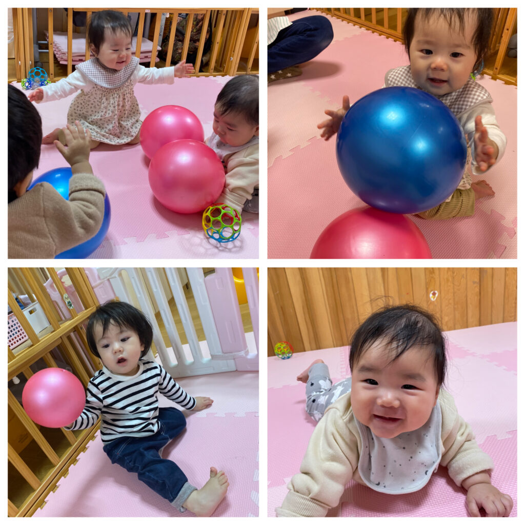 大きなボールを片手で持って嬉しそうに掲げているお友だちや、転がるボールを目で追うお友だち。ベビーベッドの中にボールを投げ込むお友だちもおり、様々な遊び方をしていてとても楽しそうでした。