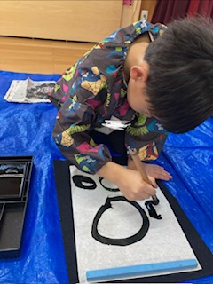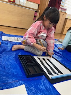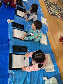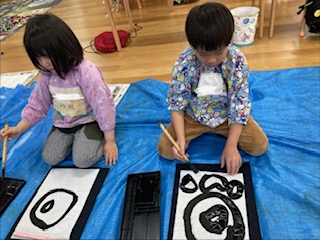 2025年12月03日(水) 12月3日 さくら組 今日は書道がありました。小さいさくら組は、丸、三角、四角を書く練習をしました。左手で半紙を押さえることを意識しながら筆で書くことを楽しんでいました。大きいさくら組は、横線、縦線を書きました。筆を半紙からゆっくりと離すことを意識して、力強い線を書いていました。