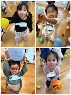 風船でラリーができるお友達が増えてきて、一緒にパスをしあうのを楽しむ姿がみられました。
