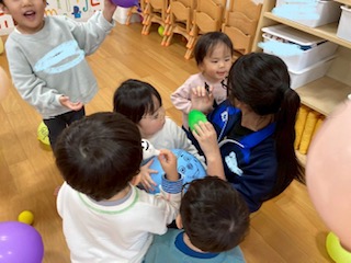 今日は登別の高校生の方が二名、保育士志望と看護師志望としてボランティアに来て下さいました。午前の英語の活動では出来る姿を見せようと大きな声で発声したり、リズムにのる姿がありました。いつになく甘えん坊のみんな、沢山遊んでもらいとっても嬉しそうないちご組のお友だちでした。