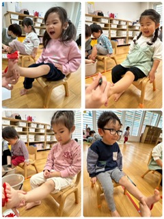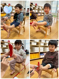 足に絵の具が塗られると、慣れない感触に不思議な表情をみせたり、くすぐったくて笑顔になったりと様々な反応が見られましたよ。