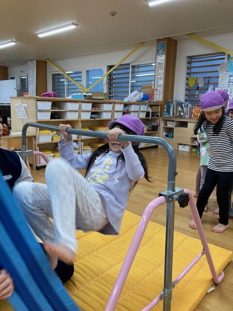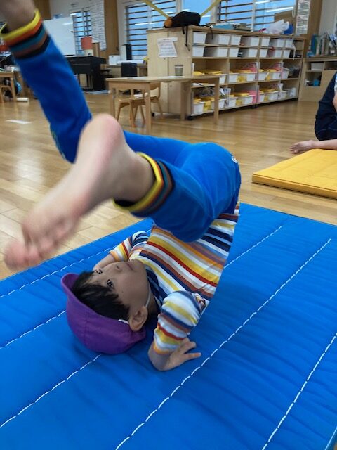 2025年11月07日(金) 11月7日 さくら組 今日は外部講師活動の体育がありました マットを手に持ち逆上がりの補助具にし、逆上がりのサポートしてもらいながら鉄棒練習をしました上手にできるようになった子どもたちがいて嬉しそうでした ロイター板を使い、跳び箱練習もしました。3段を飛べる子も出てきました。 マット運動では、前転と後転を練習しました