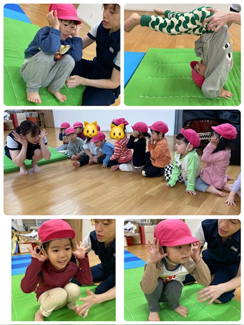 前転とうさぎ跳び(床に手をついてお尻を高く上げる動き)をすると、前回より身体の使い方が上手になり、講師に「そうそう、上手だよ」と褒められるお友だちがたくさんいました。うさぎ跳びのお尻を高く上げる動きは子どもにとっては難しいのですが、みんなよく出来ていました。