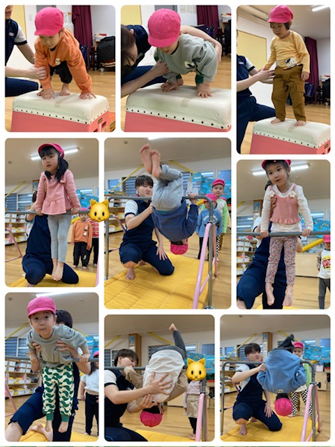 ◯鉄棒・・・腕と足をピンと伸ばす“ツバメのポーズ”に重点的に取り組み、回れるお友だちは前回りに挑戦しました。