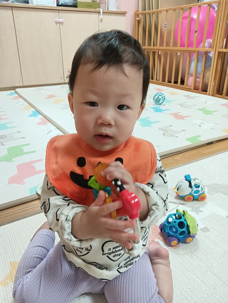 今日は午後からオーボールや赤ちゃん玩具、ペットボトルのマラカスなどで遊びました。