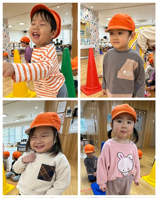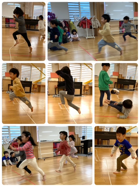 室内でもたくさん身体を動かして遊びたくて、まずはかけっこをしました。