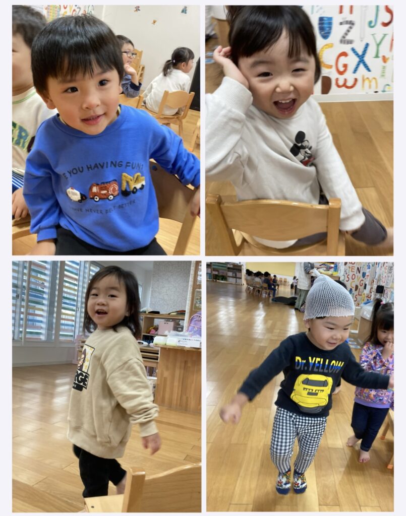 月のテーマは“形”なので、たくさんの形の言い方を覚え、頑張った後はクイズをしたり、手遊びや月の歌(きらきら星)を歌い、最後は大好きなアクションで締めくくりました。