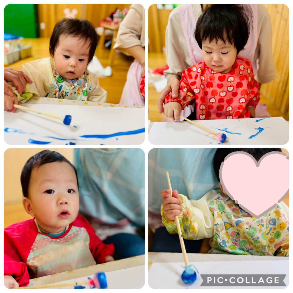 絵の具がついたタンポを使ってトントンしたり、長い線を書いてみたり。