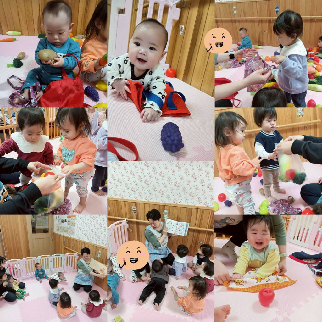口に入れてみたり、手で感触を楽しんだりしていました。お買い物カバンに好きな物を入れて、お買い物ごっこもしてみました。