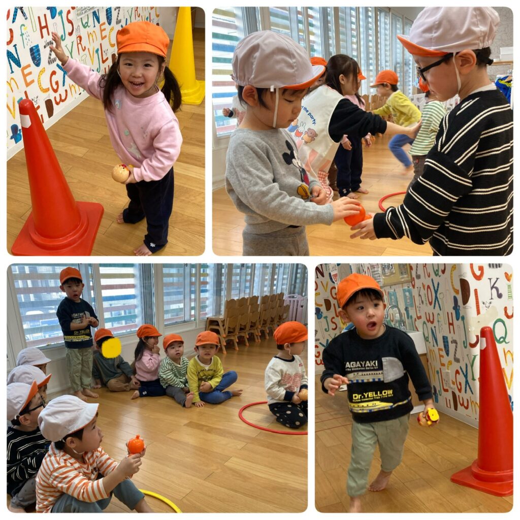 「よーいどん!」の合図でスタートし、コーンに触ってから次のお友達にバトンタッチをしました。