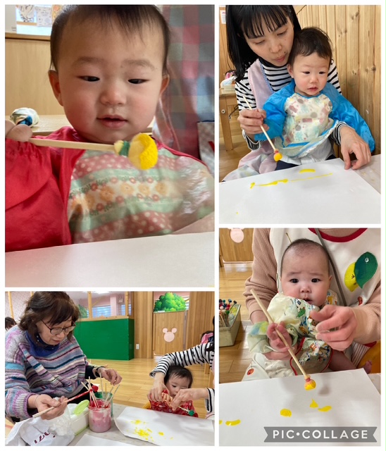 保育者の「一本橋こちょこちょ」の歌に合わせて楽しく描いたさくらんぼ組の子どもたちでした。