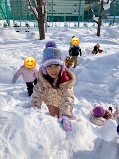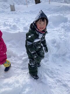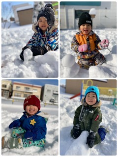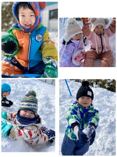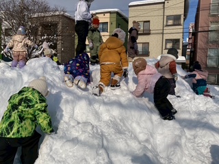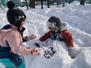 雪の山ができていたのでお尻で滑って遊んだり、雪玉で雪だるまを作ったりとたくさん雪を楽しめましたよ。