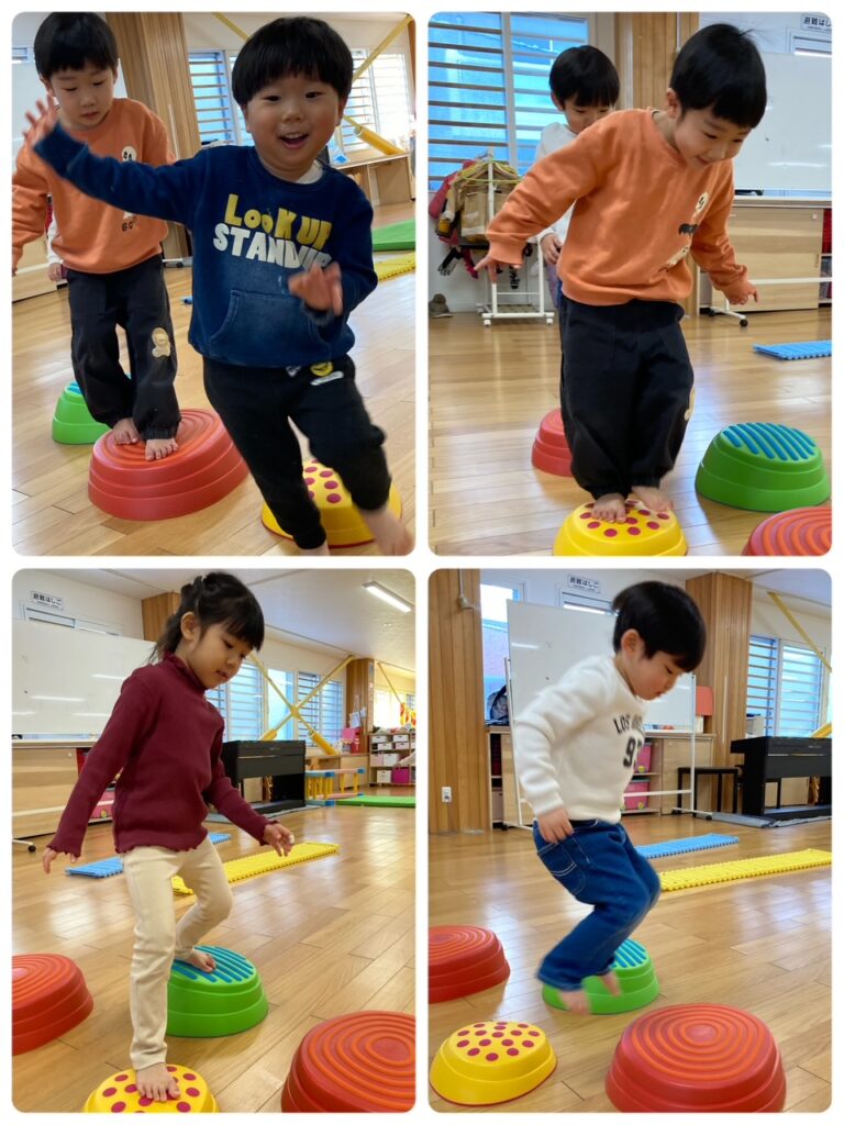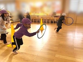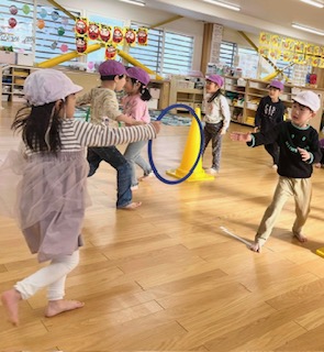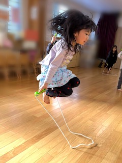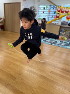 みんな1回は跳べるようになり、連続跳びする姿も増えてきました。「縄跳び楽しいね!」と言って積極的に取り組んでいるので、これからも楽しくできることを増やしていければと思っています。