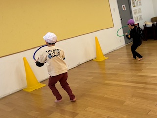 2.次の人は、三角コーンにかけてあるフープを取ってきて次の走者に渡す。