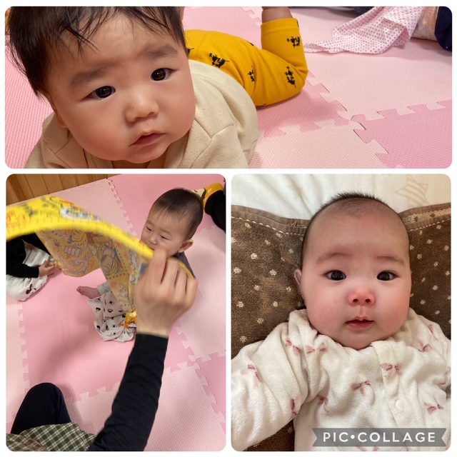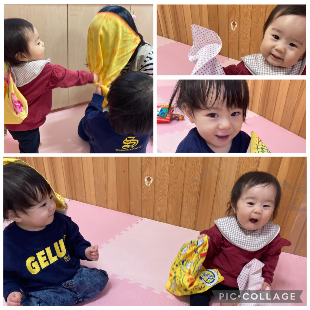 保育者がハンカチを被ってみせると、何だろう?とドキドキしながら手を伸ばしてハンカチを引っ張り、保育者の”わぁ〜”という顔が出てくると、ニコニコ笑顔で驚いて喜ぶ姿が可愛らしかったです。