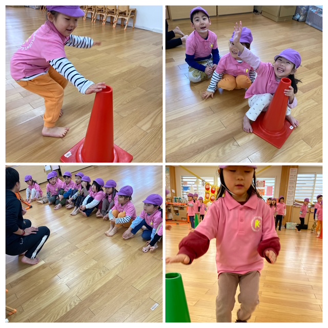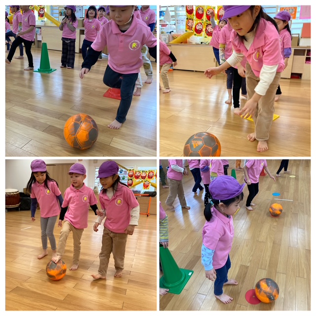次はシュートゲームです。ボールを蹴ってコーンに当てる運動をしました。