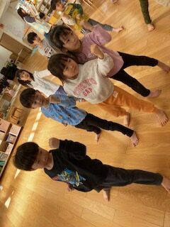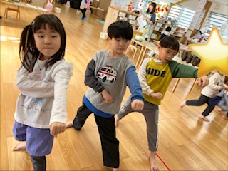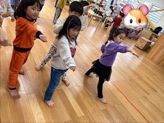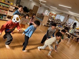 拳を前に突き出して元気良く参加していました。最後の「オオカミさん」ゲームも楽しそうにオオカミから逃げていました。