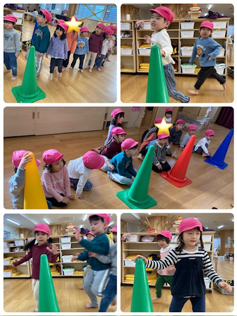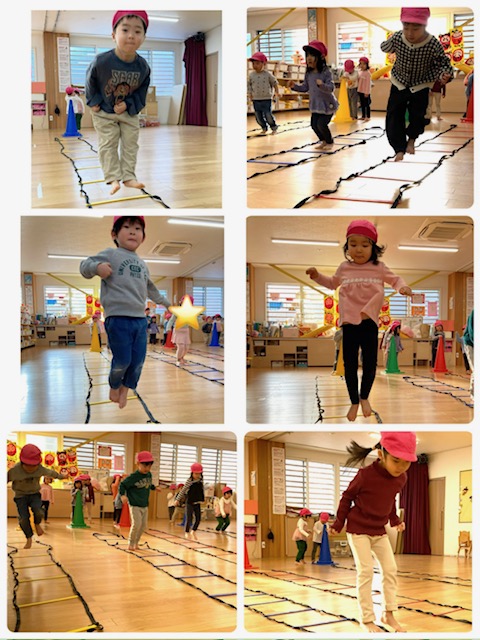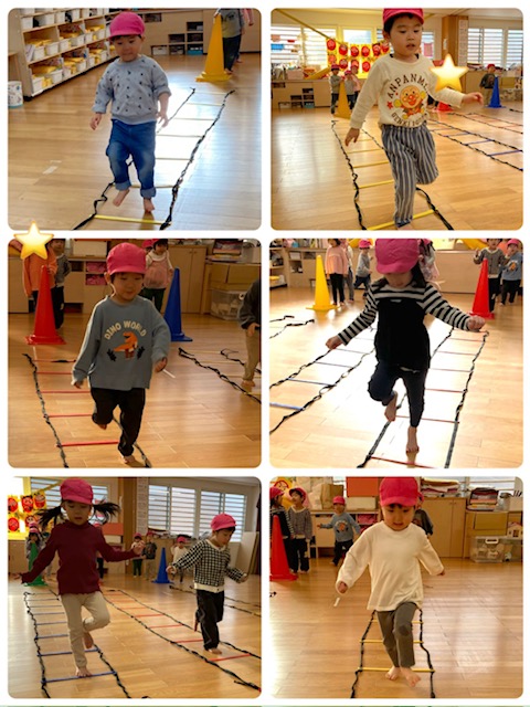 初めはバーを踏んでしまうお友だちもいましたが、慣れてくると四角の中に上手に入って走る事が出来ていました。