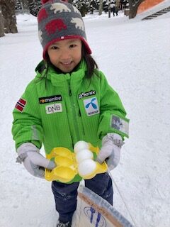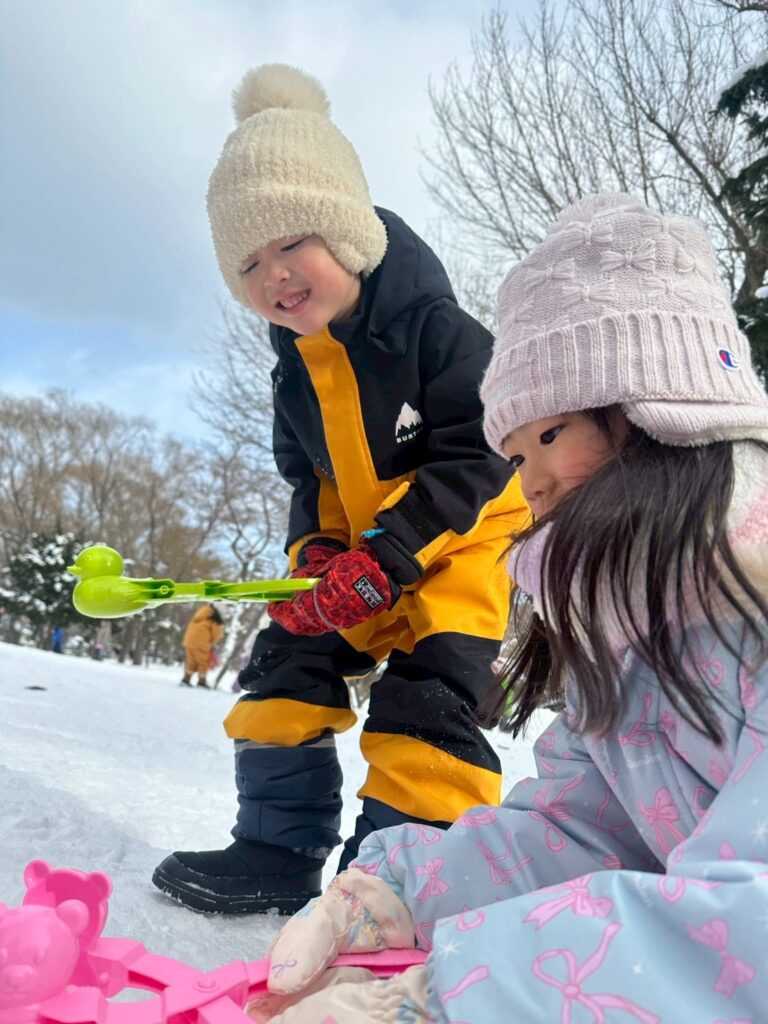 まん丸の雪玉を作り、上手に出来ると嬉しそうに見せてくれました。