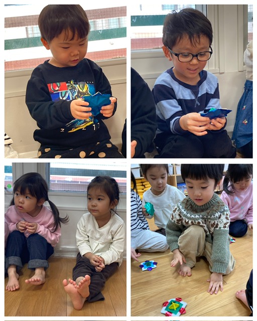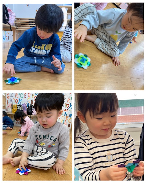 キラキラ折り紙のこまを見て目を輝かせていた子どもたち。