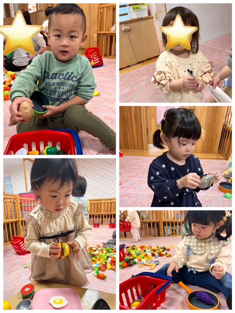 お鍋やお皿にたくさん食べ物をのせてお料理をしたり、もぐもぐ食べたり楽しく遊んでいましたよ。