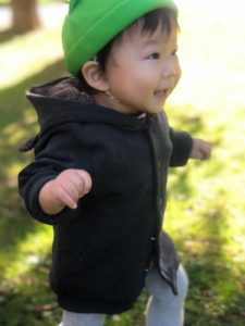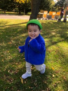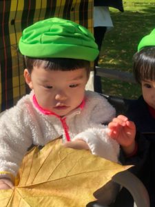 みんなで小山に登って芝生を元気一杯走り回ったり、大きな落ち葉を見つけ「わー大きい!」と大喜びの子ども達♬