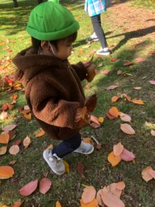 葉っぱのパリパリの感触を楽しんだり、赤や黄色の葉を見て「綺麗だね!!」と保育者と一緒に秋を感じましたよ^^