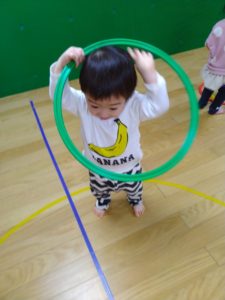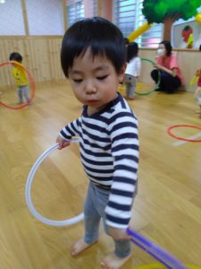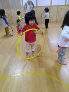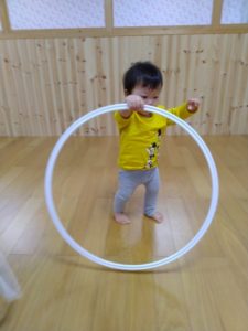フラフープをハンドルにして「しゅっぽー!」と汽車に乗っている気分を味わったり、くるくるして遊びましたよ^^