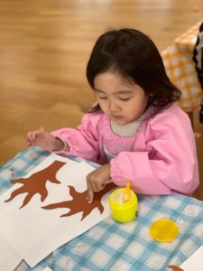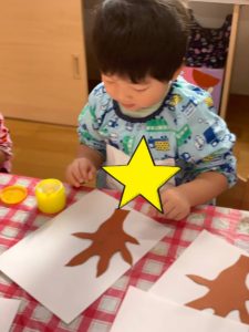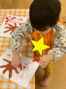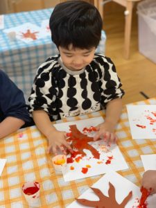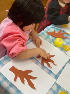 赤、オレンジ、黄の絵の具を人差し指につけ、貼った幹の周りや枝の先にポンポンとつけていくと、段々と木に葉がついたようになり「わぁー!」と目を輝かせながら指スタンプを楽しんでいましたよ(^ ^)