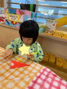 飾りつけが終わると、自分の飛行機をお友達に見せ「可愛いね!」「かっこいいね!」などとお友達同士褒め合っていましたよ♬