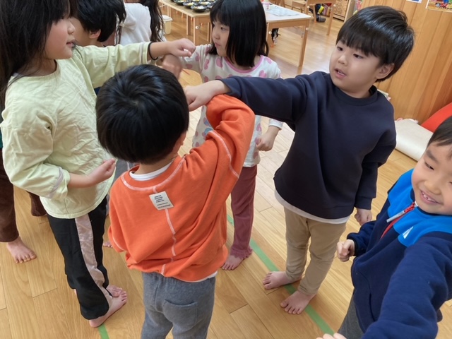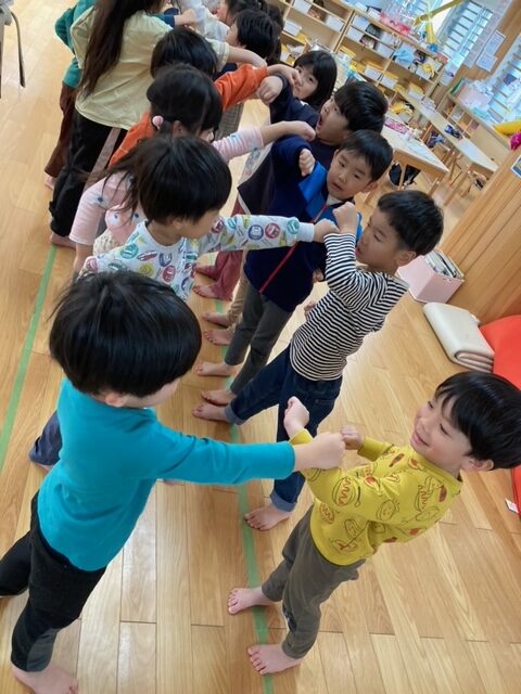 お友だちの顔を見ると楽しくなって、ついつい笑ってしまいますが、必死に堪えて組み合います。